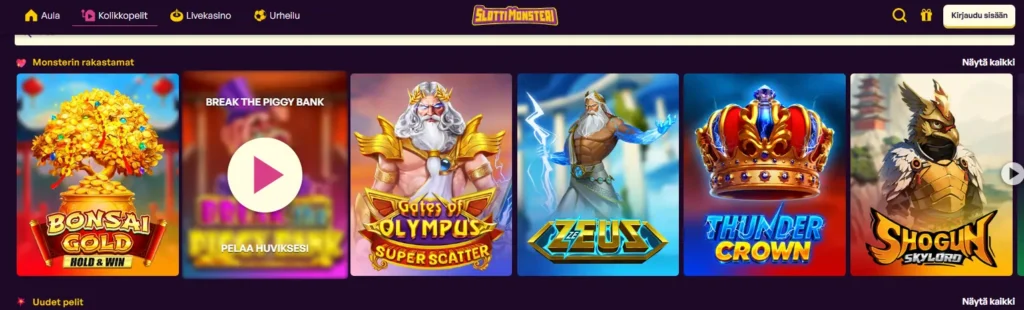 Slottimonsteri on kotimaisille pelaajille suunnattu hybridi/pikakasino, jolla tunnistautuminen pelaajaksi ja ensitalletus tapahtuvat Trumon avulla. Tarjolla on myös monia muita maksutapoja, joihin pääset käsiksi pelitilin avaamisen myötä. Pay N Play -ominaisuuden lisäksi annamme kiitosta nopeista kotiutuksista, erinomaisesta pelivalikoimasta ja houkuttelevasta tervetuliaisbonuksesta. Positiivista on toki myös se, että muitakin etuja ja kampanjoita on tarjolla.